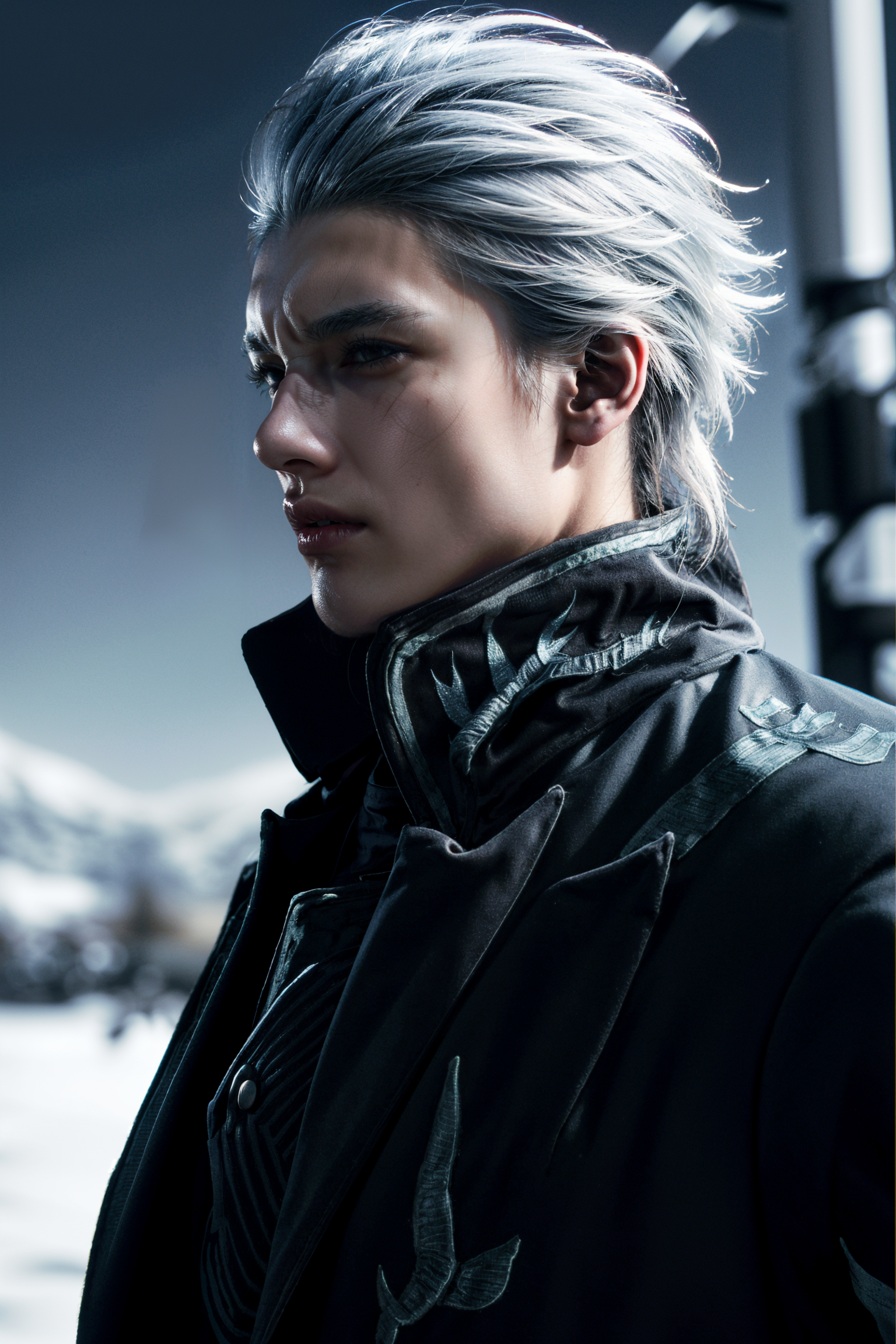 ((ultra detailed, masterpiece, absurdres)), <lora:DMC5Vergil:0.9>, DMC5Vergil,1boy,solo,short hair,white hair,Athletic activewear,dramatic sidelight,dynamic posing,showcasing fitness,black coat,insane detailed,photorealistic,realistic,real,from_side,high contrast,((upper_body:1.6)),<lora:more_details:0.5>,