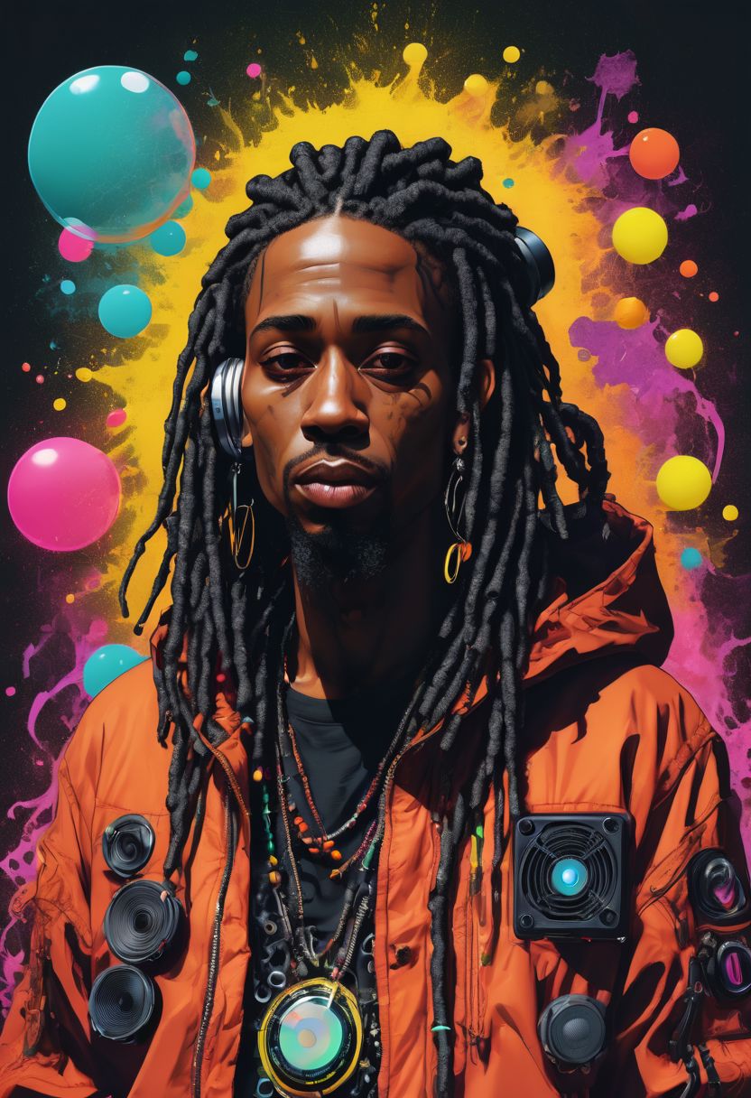 1 rapper with dreads hair, ToxicPunkAI techwear jacket, minimalist abstract ToxicPunkAI music mixer and speakers background, bubbles, melt, detailed, intricate