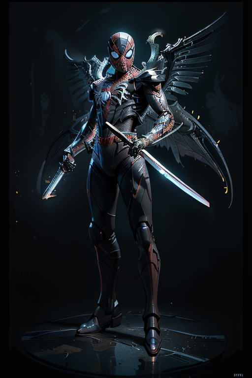 (masterpiece, best quality:1.3),(cowboyshot,full body shot),extremely high detailed, intricate, 8k, HDR, wallpaper, cinematic lighting, <lora:Mecha:1> ,large katana, glowing, glowing eyes, mecha, realistic, baby spiderman, mecha wings, <lora:4960_fireflies:1>