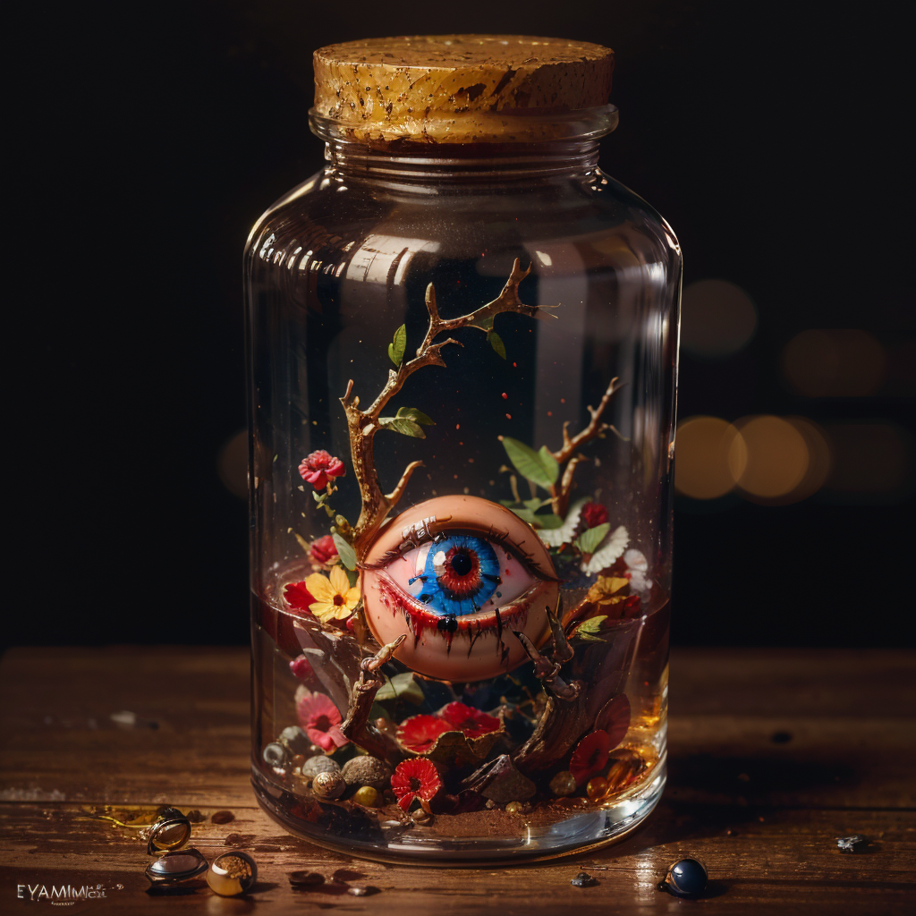 masterpiece, best quality, realistic, 8k, official art, ultra high res, cinematic lighting, horror \(theme\), (eyeball:1.5),<lora:Bottle_Sora:0.6>,bottle, in glass bottle, on table, flesh, blood, disembodied limb, disembodied limb, blood, blood splatter,flower, bloom, (no human:1.3),
