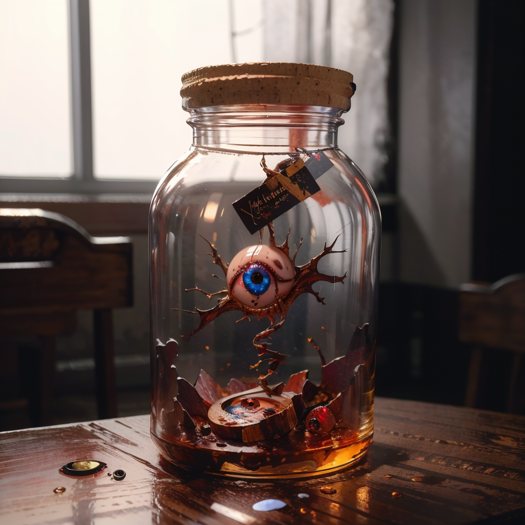 masterpiece, best quality, realistic, 8k, official art, ultra high res, cinematic lighting, horror \(theme\), (eyeball:1.5),<lora:Bottle_Sora:0.6>,bottle, in glass bottle, on table, flesh, blood, disembodied limb, disembodied limb, blood, blood splatter,flower, bloom, (no human:1.3),
