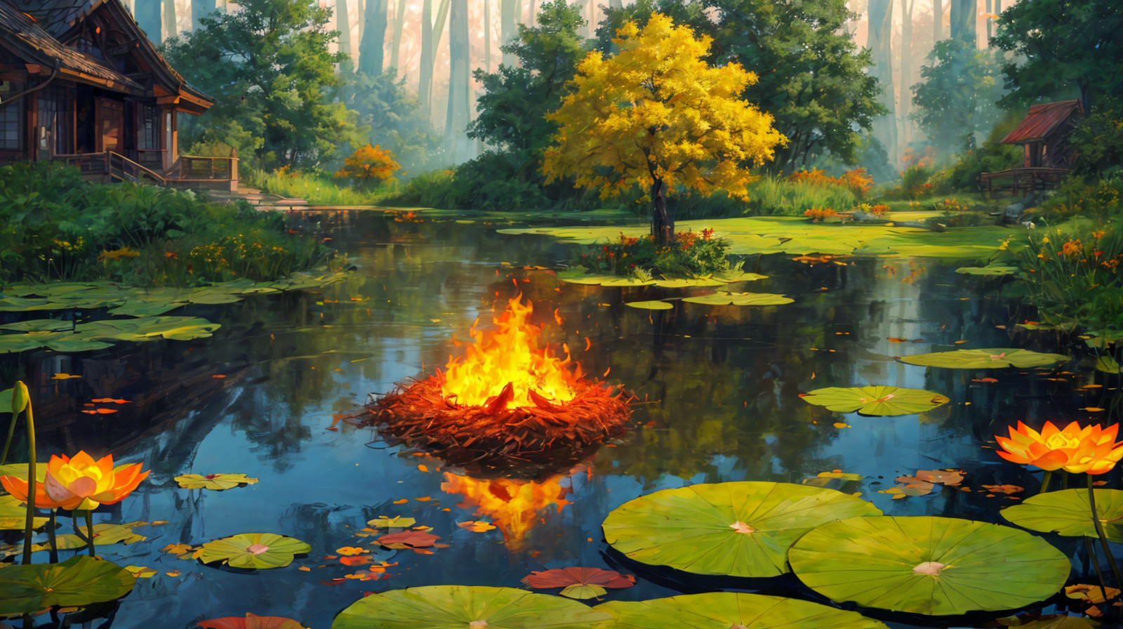 (masterpiece, HDR, 8k, UHD, wallpaper, highly detailed), vivid color, (fire:1.2), (wind blow:1.3), crystal, pond, water ripple, floating leaf, grass, stone, plant, lotus, maple, grass, rock, forest, <lora:add_detail:1>