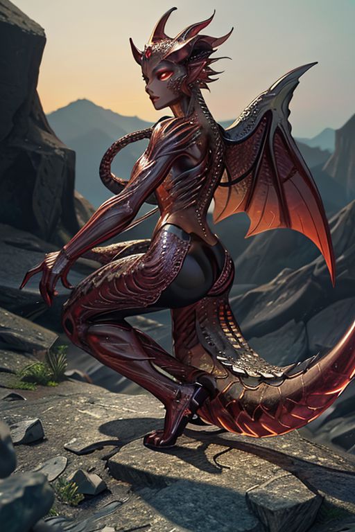 ((best quality)),absurdres, (ultra high res), clear red crystal glass demon landing on a rocky craig, long neck with spines, ribs showing in the paired, long outstretched clear wings, extremely detailed, intricate detail, realistic, tail narrows to a forked point, feet have just touched down, (realistic), (8k), (Masterpiece), <lora:sculpture:0.8> glistens with back lighting, regal, majestic, smattering of scales on body, head has open jaws with sharp teeth showing. Thin, lithe, sinuous