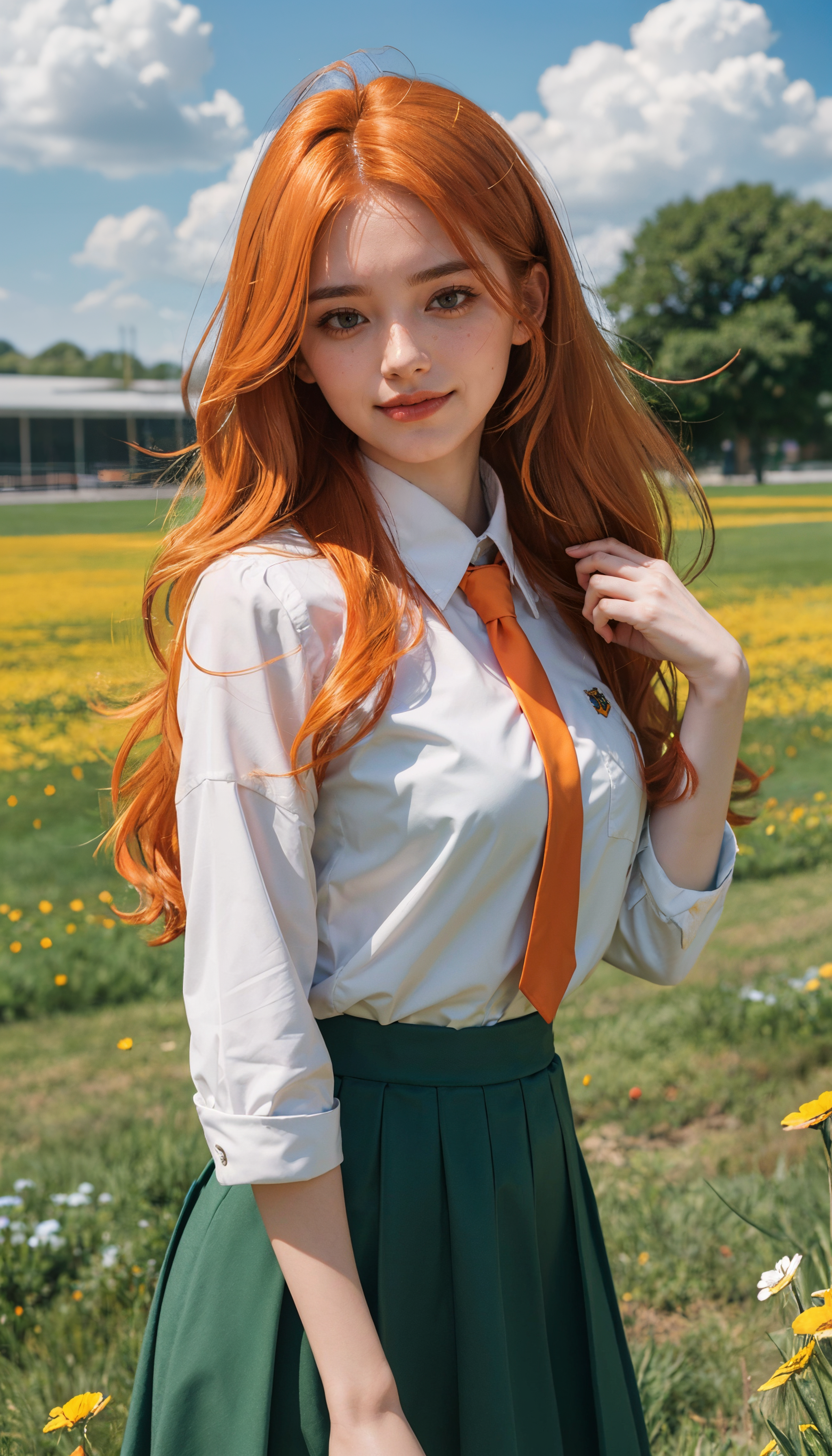 best quality:1.2, 1girl, portrait, upper body, hands behind the back, orange_hair, green_eyes, long_hair, beautiful, highschool uniform, blue sky background, cloudy, sunny, outdoors, grass field, flowers, flying leaves, happy face,