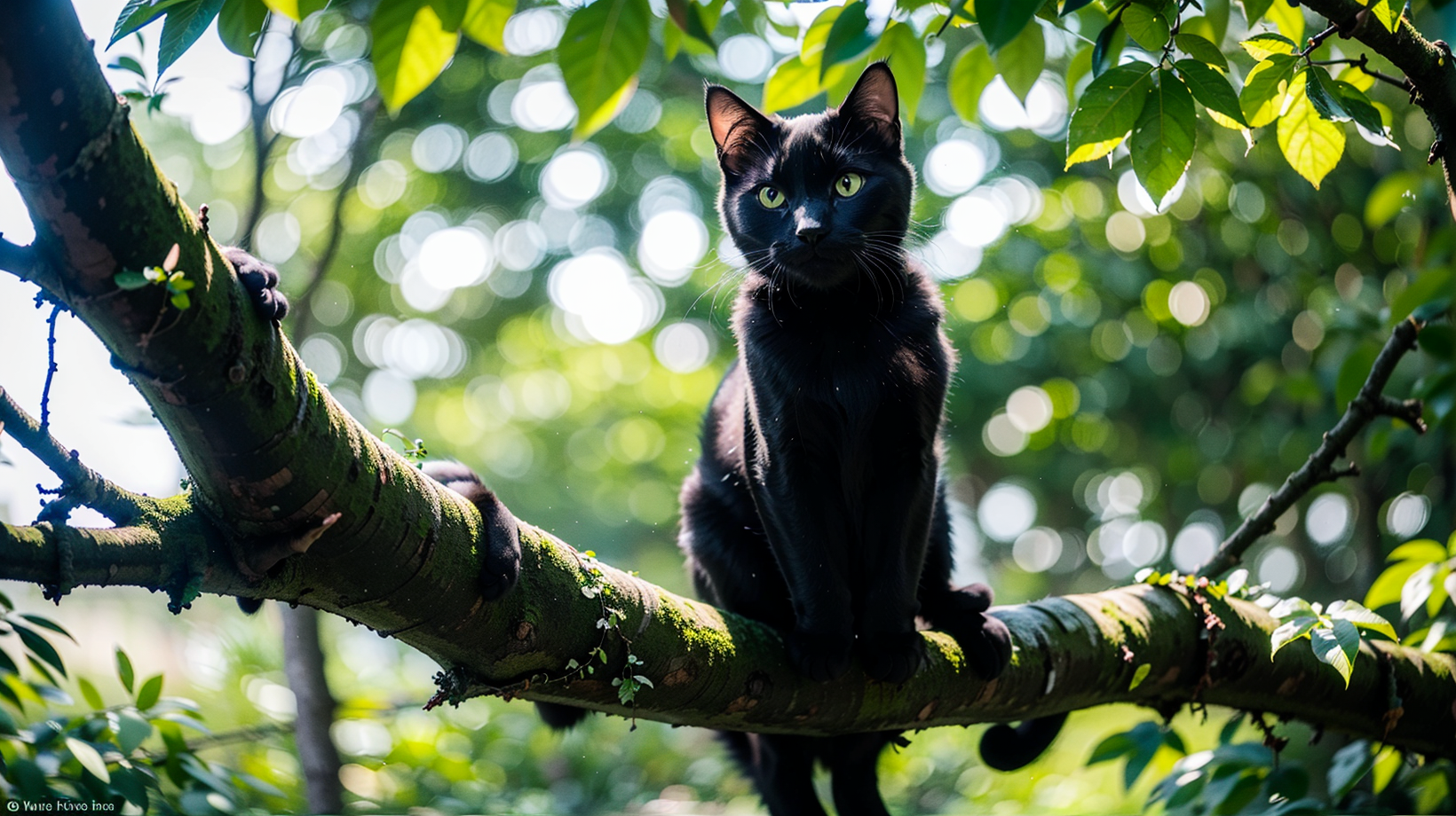 Background: A lush green forest Subject: A black cat sitting on a tree branch Appearance: It has sleek black fur and bright green eyes. Pose: It is sitting with its tail wrapped around its paws. Details: Its fur is glossy and well-groomed. Its eyes are sharp and alert. Effects: A few leaves are falling from the tree around it. Description: A sleek black cat sits on a tree branch, surveying the forest below.