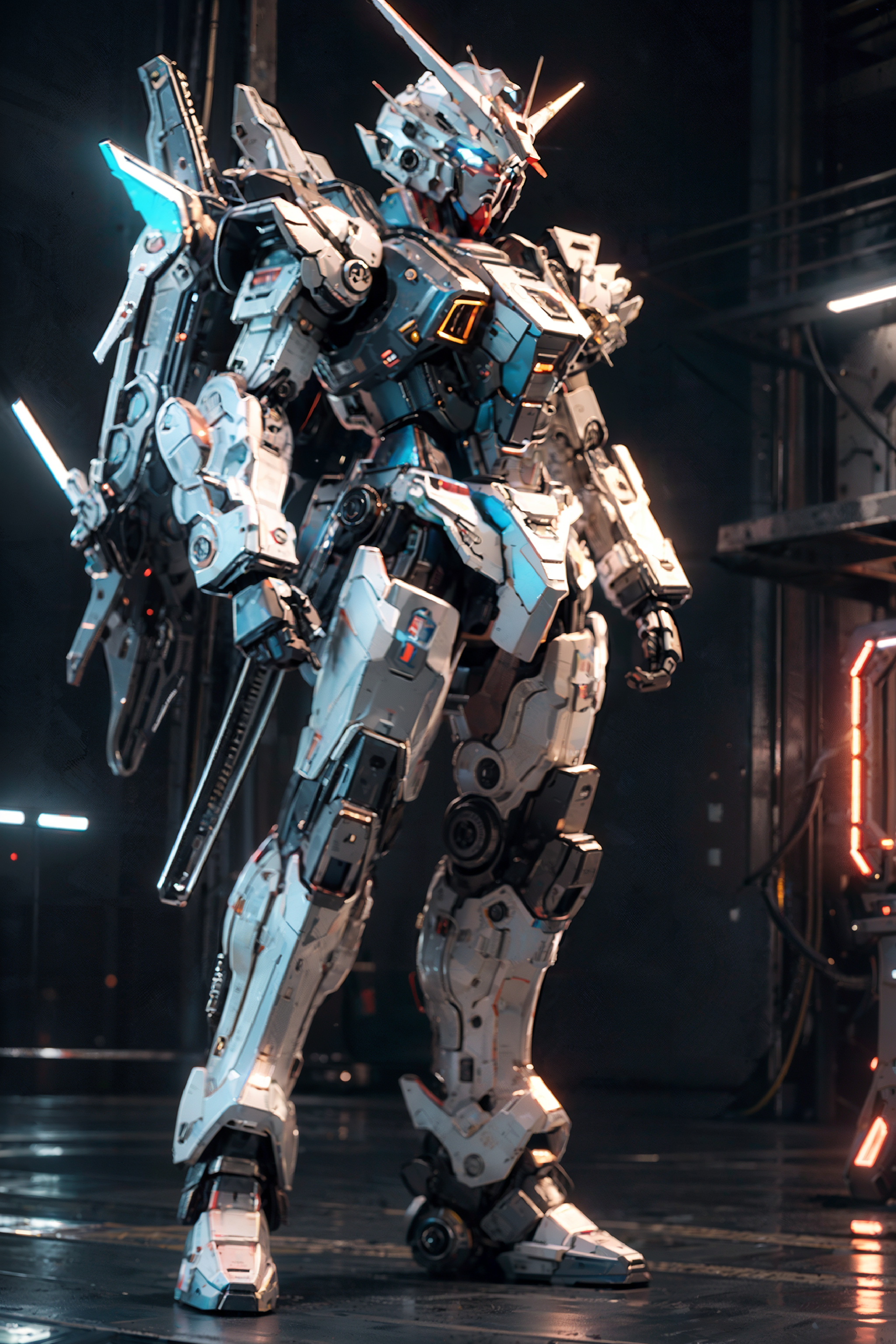 bj_gundam, solo, looking_at_viewer, blue_eyes, standing, no_humans, glowing, robot, mecha, glowing_eyes, clenched_hands, science_fiction, straight-on, v-fin, mobile_suit, cinematic lighting, strong contrast, high level of detail, Best quality, masterpiece, neon background, (wide angle, full body shot:1.4), <lora:Gundam_Mecha_v3.1:0.9>