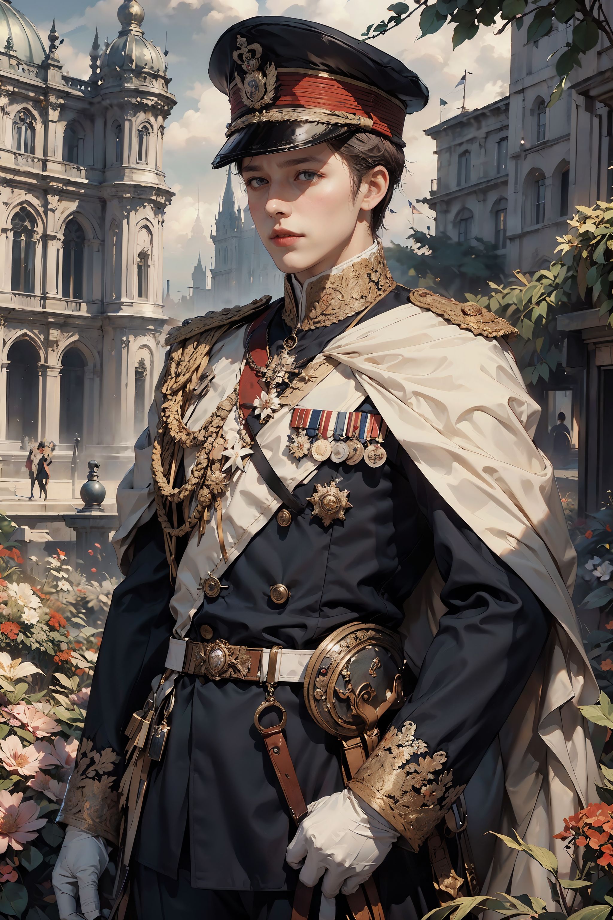 HDR,UHD,8K, best quality, masterpiece, Highly detailed, Studio lighting, physically-based rendering, 1boy, solo, 1 boy, British Noble, white costume, cap, dark blue uniform, flowers garden background, simple background, <lora:BristishNoble:0.5>