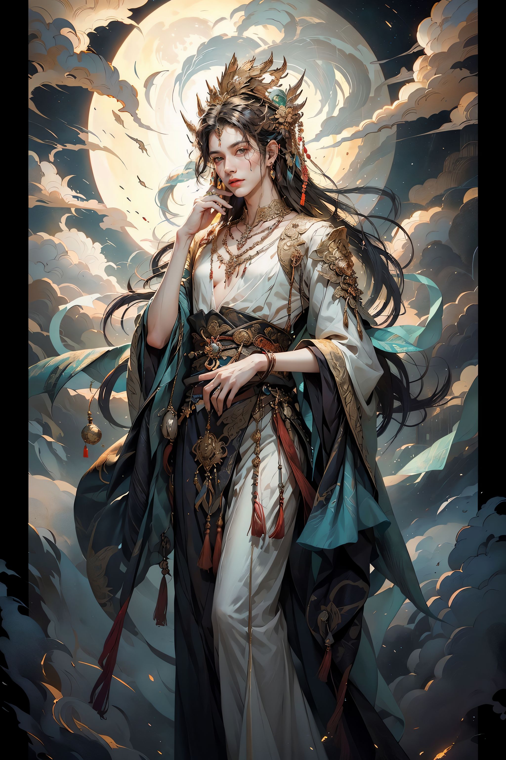 HDR,UHD,8K, best quality, masterpiece, Highly detailed, Studio lighting, physically-based rendering, 1boy, solo, aicient chinese clothes, god male, flying, cloud, long hair, black hair, the big moon, Detailed head ornament, emerald necklace, (white costume), gloss skin, manly, <lora:add_detail:0.3> <lora:MaleGod:0.6>