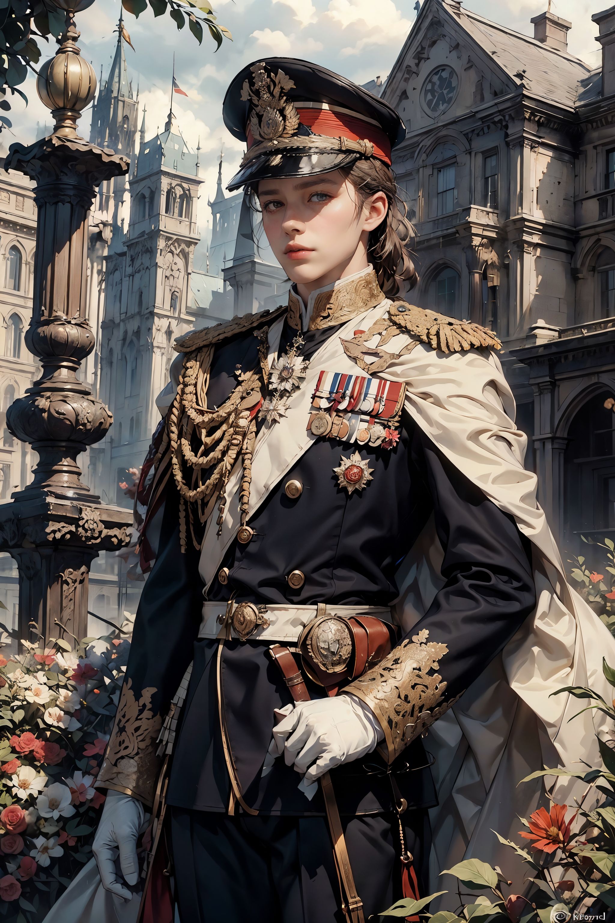 HDR,UHD,8K, best quality, masterpiece, Highly detailed, Studio lighting, physically-based rendering, 1boy, solo, 1 boy, British Noble, white costume, cap, red , uniform, flowers garden background, <lora:add_detail:0.3> <lora:BristishNoble:0.5>