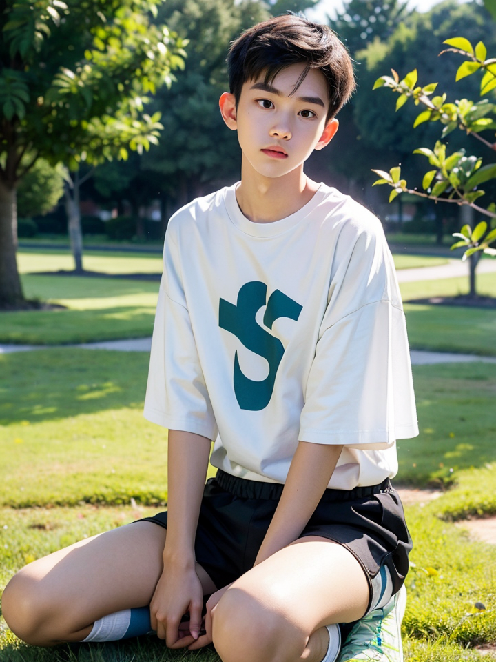 1boy with round face,(differential crushed cap hairstyle),black shorts,nike white socks,small white shoes,white blue t-shirt,(round face),chibi,(teen:1.3),skinny,(bangs),chinese,nike \(0306\),university student,(broken hair),perm,wisdom,face shape: round face,upper body,Best Quality,Masterpiece,Ultra High Resolution,(Realisticity:1.4),Original Photo,1boy,<lora:muscle_slider_v1:-1.4>,