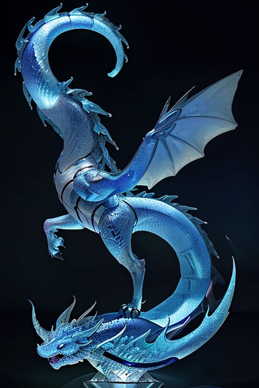 ((best quality)),absurdres, (ultra high res), clear blue crystal glass sculpture of a dragon landing, long neck with spines, ribs in the outstretched clear wings, extremely detailed, (realistic), (8k), (Masterpiece), <lora:sculpture:0.8> glistens with back lighting, regal, majestic, smattering of scales on body