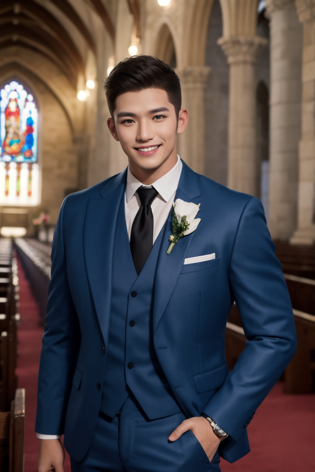 <lora:nwsj_boy_v1.0:0.7:FACE>1man, crew cut, watch, cowboy_shot, smile, Muscular Frame, looking at the viewer, groom's formal wear, church,