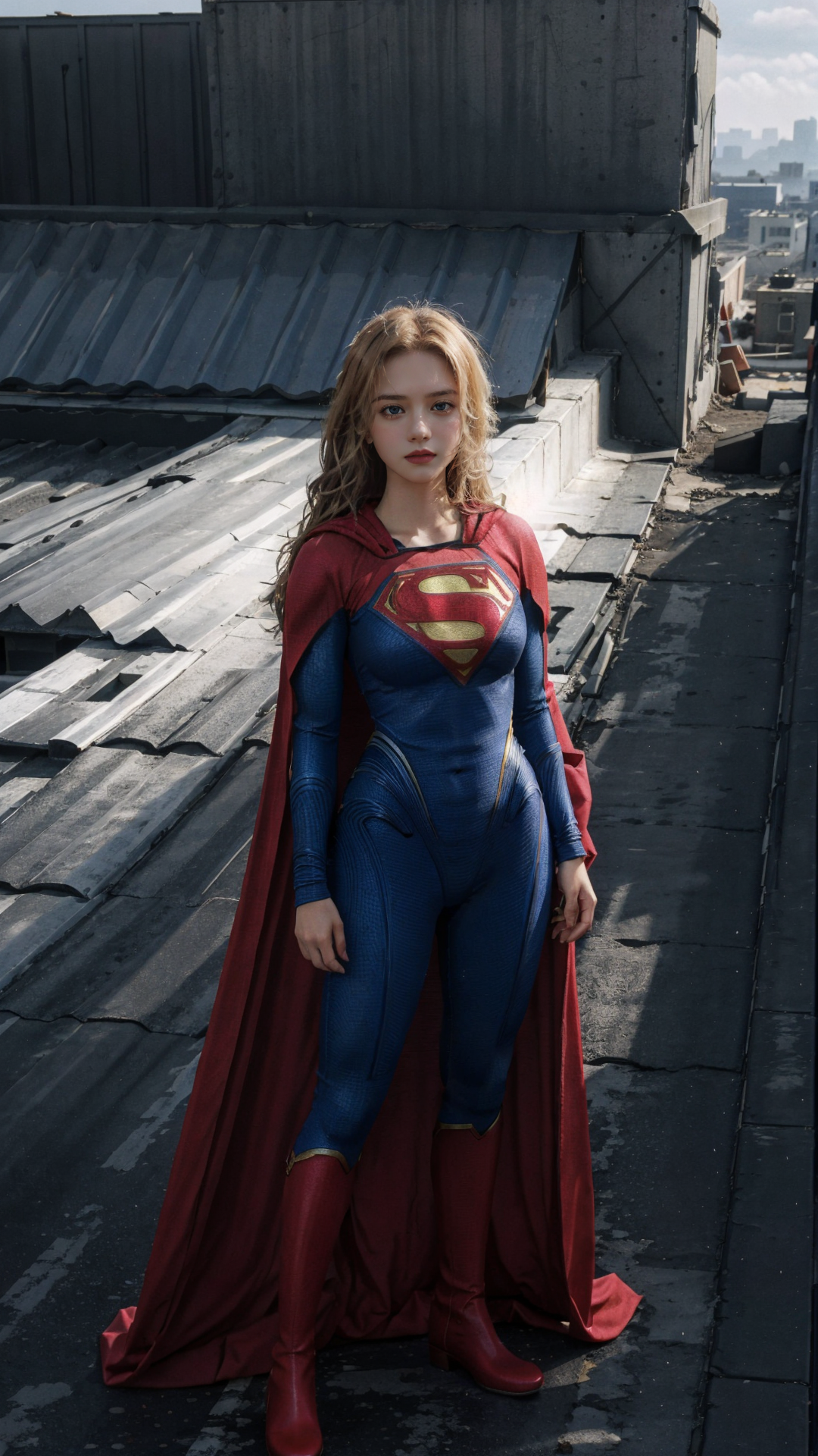 realistic photo, best quality, fantastic light, full body wide frame photography, from below, American girl, ((Supergirl)), red cloak, red boots, perfect body, pants, red lips, (angry face), (bright blue eyes), eyes detail, skin detail, small waist, long legs, small thighs, ((long blonde hair:1.4)), medium size pear breasts, ((standing on the roof of a building)), air polluted, sunlight, light on face, masterpiece,ultra realistic,32k,extremely detailed CG unity 8k wallpaper, best quality