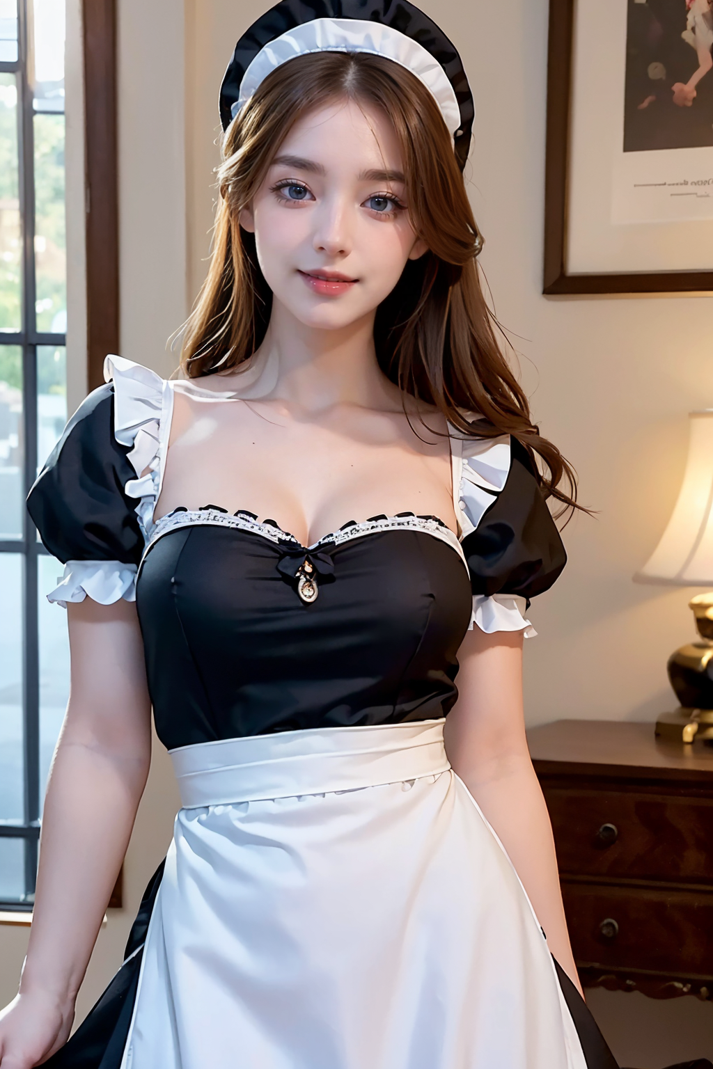 (RAW photo, best quality, photo realistic:1.2), (intricate details, perfect anatomy), (1girl,solo:1.2) (indoors, victorian mansion), (detailed background:1.2), (27 years old beautiful gorgeous cute English woman:1.1), hugh breasts, (pale skin, shiny skin, porcelain skin, white skin, tall female), (make up:0.2), (parted lips, brown hair, blue eyes, perfect eyes), groin, ( victorian maid, black maid dress, maid apron, maid headdress:1.2), (cowboy shot), (smile), <lora:cuteGirlMix4_v10:0.3>,