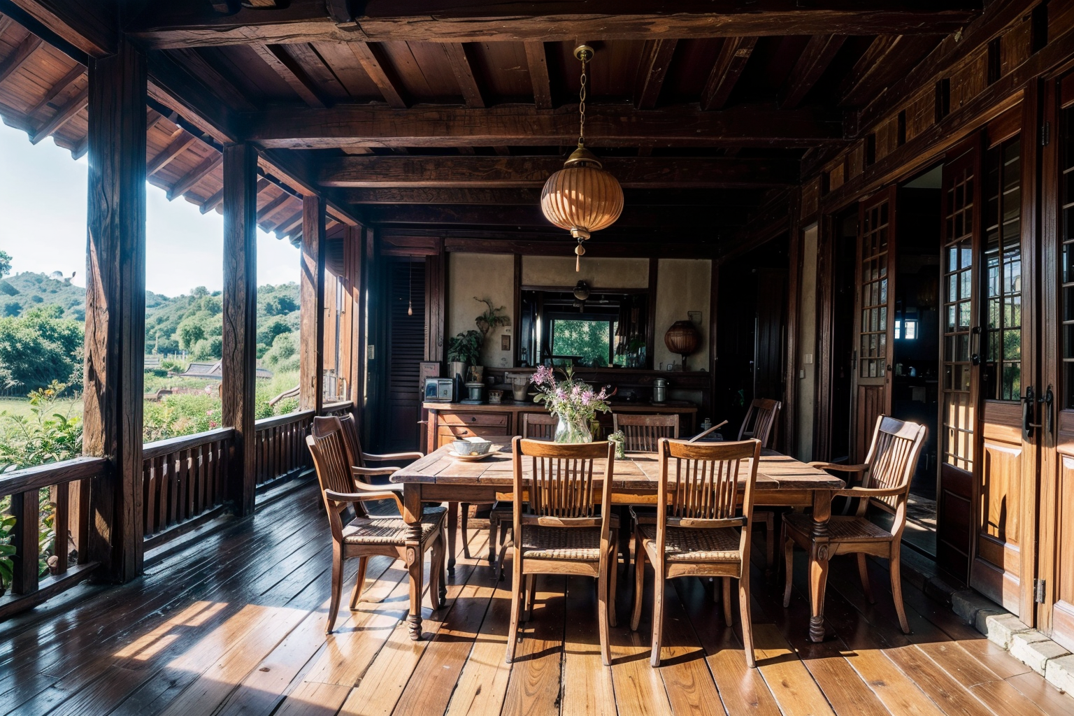 masterpiece,ultra realistic,32k,extremely detailed CG unity 8k wallpaper, best quality (Vintage Vietnamese house:1.3),(Rustic charm:1.2),(Traditional architecture:1.4),(Antique wooden furniture:1.3),(Weathered table and chairs:1.2),(Beautiful garden view),(Soothing tea aroma:1.3),(Gentle sip from the cup:1.2),(Sunlight filtering through the windows),(Tranquil atmosphere:1.3),(Appreciating nature:1.2),(Relaxation:1.4),(Peaceful moment:1.3)<lora:add_detail:1.0>