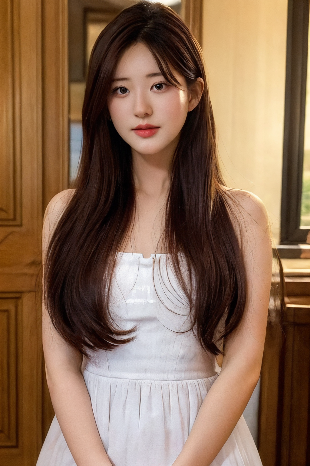 1girl,(masterpiece, best quality:1.2),realistic,indoors,long hair,black hair,looking at viewer,<lora:zls1:0.7>,dress,upper_body,