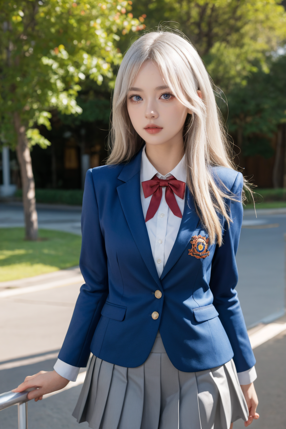 (Best Quality, Masterpiece:1.4), (Realism:1.2), (Realisitc:1.2), (Absurdres:1.2), (photorealistic:1.3), Realistic Skin,Solo,( Very Big Eyes,beautiful detailed eyes, symmetric eyes,), ((cowboy shot)),1girl,solo, aadna, long hair, white hair, hairclip, brown eyes, breasts, school uniform, red bowtie, collared shirt, blazer, blue jacket, long sleeves, pleated skirt, grey skirt, <lora:echidna_(re_zero)_v1:0.8>, reaching out, park,