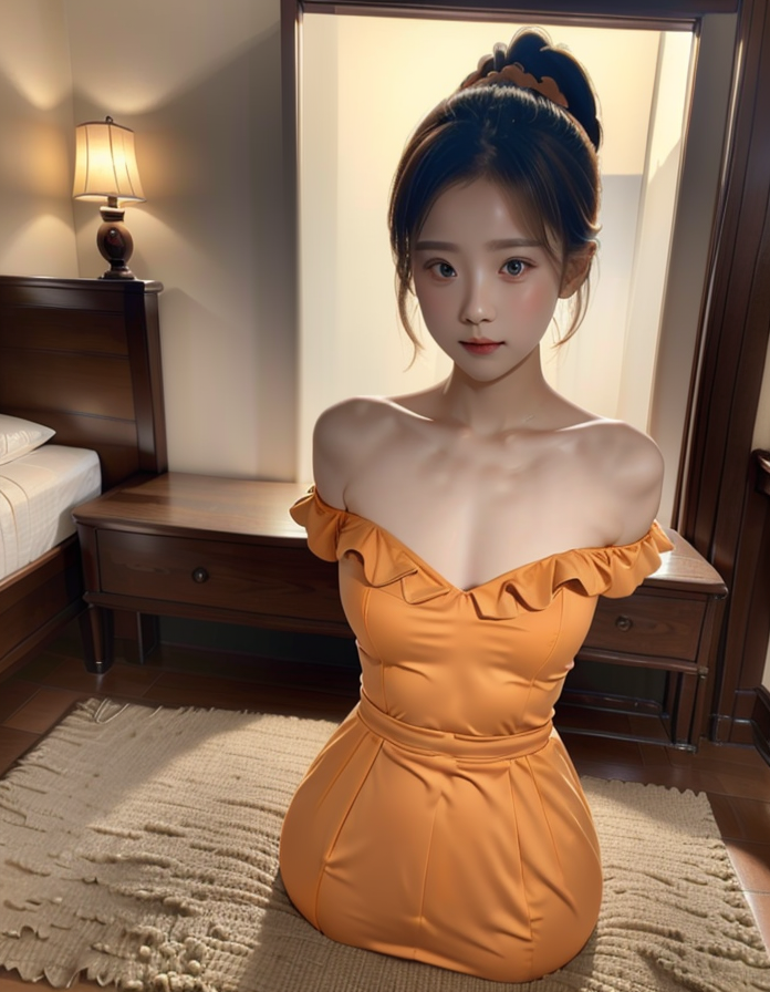 (limbless:1.1), (full body), (8k, best quality, masterpiece:1.2), (realistic, photo-realistic:1.37), front lighting,(bokeh:1.2),ultra high res, professional lighting, physically-based rendering, wide shot, girl, 1girl, (solo:1.1, shourt girl), thin, (slim waist), (beautiful face, beautiful eyes, perfect female figure), wearing orange off-the-shoulder dress with ruffle neckline, mouth closed,shy,pureerosface_v1, (medium breasts:0.8305273504896755), (indoors, bedroom), medium hair, messy bun with textured twists, <lora:limblessv55-34:0.7>