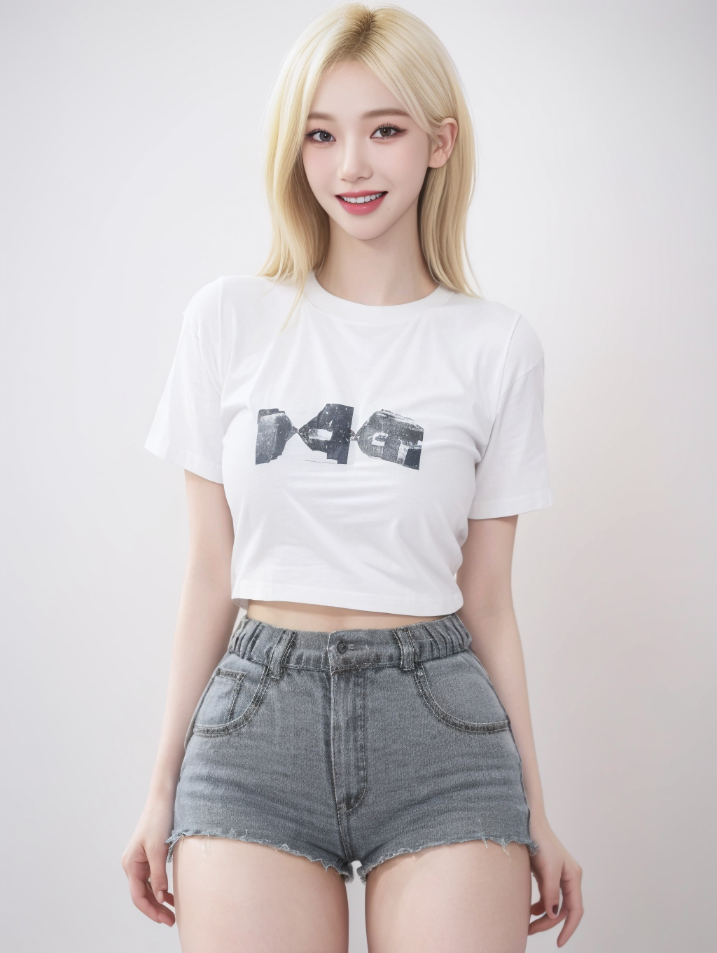 1girl, solo, realistic, <lora:Lovesh-KarinaV1:1>, smile, teeth, blonde hair, gigantic sagging breasts, short thin waist, large pelvis, (thighs:1.6), white t shirt, black (short:1.6) shorts, (high quality:1.4), (photorealistic:1.6), 8k, uhd, highres, absurdres, professional photo, highly detailed, detailed skin, high detail, hyper realistic, intricate sharp details