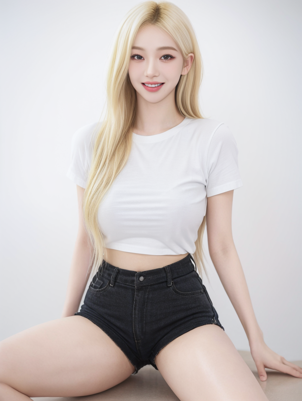 1girl, solo, realistic, <lora:Lovesh-KarinaV1:1>, smile, teeth, blonde hair, gigantic sagging breasts, short thin waist, large pelvis, (thighs:1.6), white t shirt, black (short:1.6) shorts, (high quality:1.4), (photorealistic:1.6), 8k, uhd, highres, absurdres, professional photo, highly detailed, detailed skin, high detail, hyper realistic, intricate sharp details