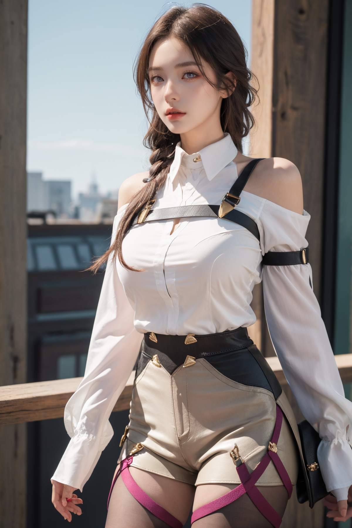 (Best Quality, Masterpiece:1.4), (Realism:1.2), (Realisitc:1.2), (Absurdres:1.2), (photorealistic:1.3), Realistic Skin,Solo,( Very Big Eyes,beautiful detailed eyes, symmetric eyes,), ((cowboy shot)),1girl,solo, aakafka, sunglasses, eyewear on head, harness, shoulder cutout, white shirt, collared shirt, long sleeves, white sleeves, purple gloves, black shorts, thigh strap, pantyhose, <lora:kafka_1:0.8>, standing, cowboy shot,