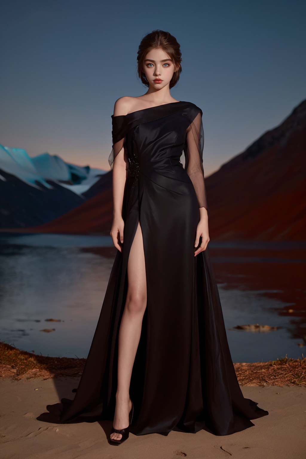 a fashion portrait of a beautiful female super model wearing haute couture of Dark Chocolate Brown, photo by edward weston, professional medium format film, sharp focus, autumn, evening, beautiful scenery, glacier, (full body:1.4), blue gray eye pupil, <lora:weber:0.9>