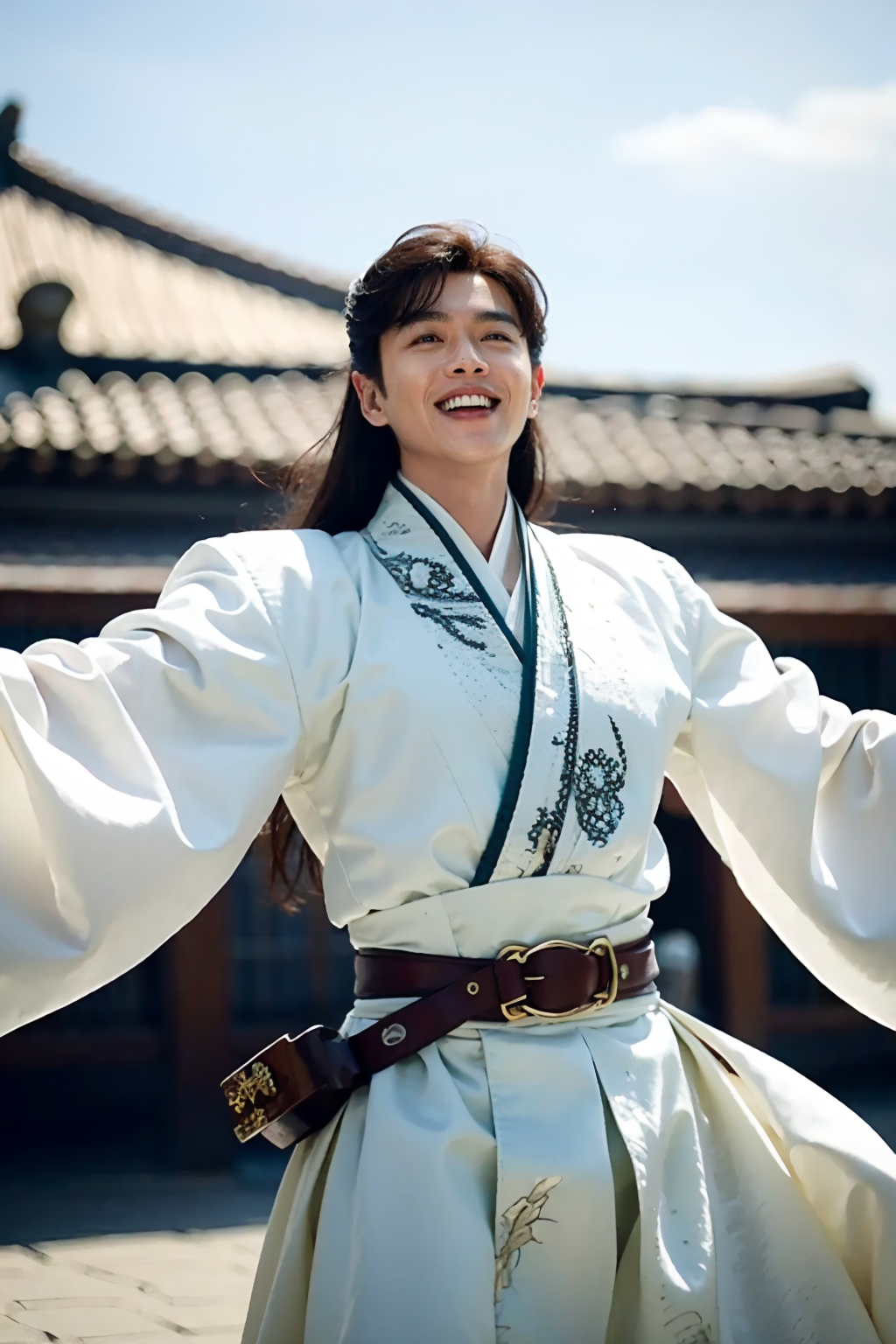 <lora:ruoyun1.0:0.8>,ruoyun,(1boy:1.2),solo,looking at viewer,long hair,ponytail,hair ornament,(open mouth:1.2),smile,(teeth:1.2),floating hair, white chinese clothes,hanfu,long sleeves,wide sleeves,open arms,stretching, blurry background,(running:1.2),cowboy shot, masterpiece,best quality,ultimate details,highres,8k,wallpaper,extremely clear,realistic,photorealistic.,