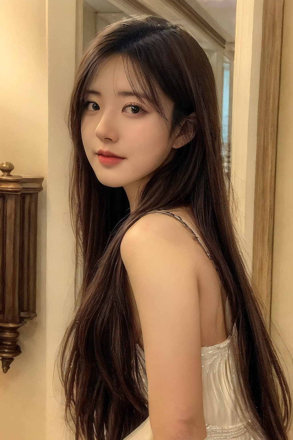 1girl,(masterpiece, best quality:1.2),realistic,indoors,long hair,black hair,looking at viewer,<lora:zls1:0.7>,dress,