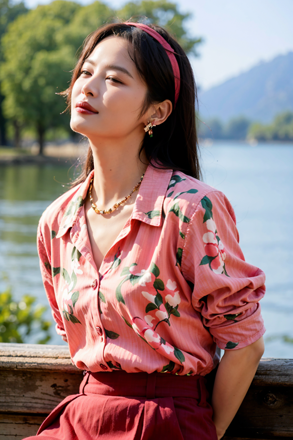 <lora:zhilei1.0:0.8>, zhilei,1girl,solo,looking to the side,closed eyes,twin braids,closed mouth,floral hairband,earrings,necklace,jewelry,smile,head tilt,looking up,head_up, red shirt,floral shirt,black skirt, arms behind back, cowboy shot, lake,outdoors,blurry background, masterpiece,best quality,ultimate details,highres,8k,wallpaper,extremely clear,realistic,photorealistic,