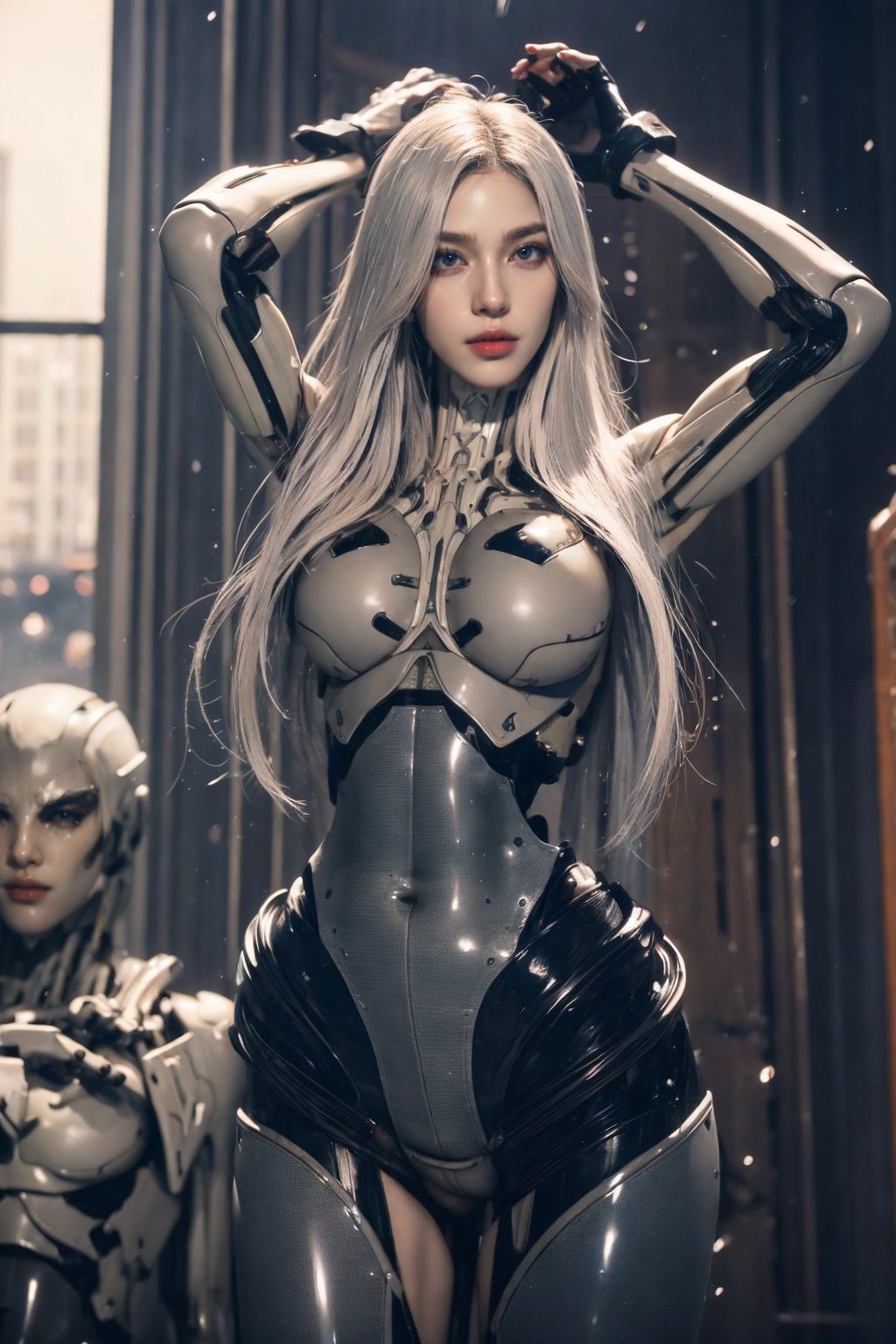 1girl,solo,cowboy shot,standing,ruanyi0690,robot,android,ruins,white hair,very long hair,,,arms up,<lora:0690 StellarBlade ENYA_v1:1>,<lora:detail_slider_v4:2>, best quality,masterpiece,highres,official art,extremely detailed cg unity 8k wallpaper