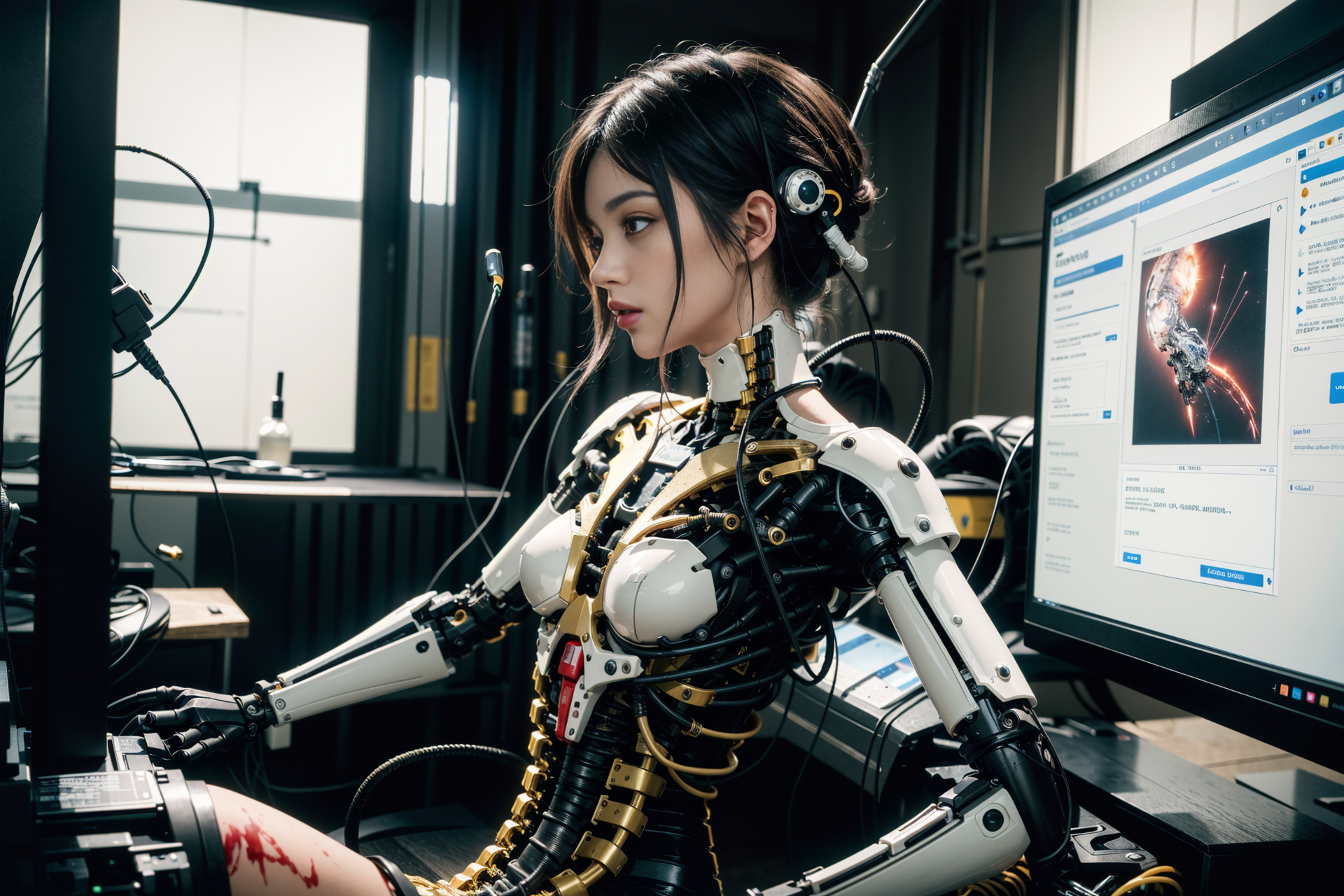(((masterpiece))),(((best quality))),((ultra-detailed)),(highly detailed CG illustration),((an extremely delicate and beautiful)),(cute delicate face),cinematic light,((1mechanical girl)),solo,full body,(machine made joints:1.4),((machanical limbs)),(explosed muscles),(blood vessels connected to tubes),(a brain in container:1.3),((mechanical vertebra attaching to back)),((mechanical cervial attaching to neck)),machanical limbs,blood vessels connected to tubes,mechanical vertebra attaching to back,mechanical cervial attaching to neck,sitting,wires and cables connecting to head,((sitting)),expressionless,(wires and cables attaching to head and body:1.5),small breasts,short hair,(character focus),science fiction,(masterpiece, best quality, ultra-detailed, best shadow),<lora:A-Mecha_SuperMecha>,