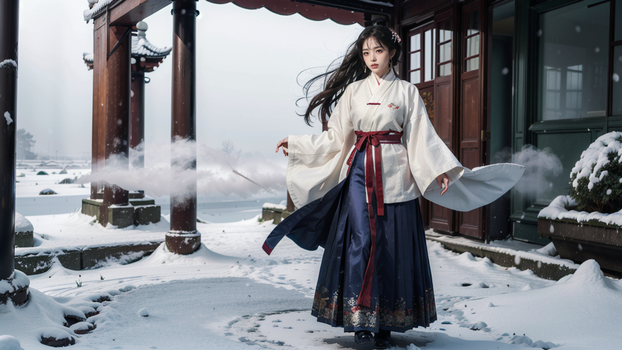dark sky,feature article,ancient background,Ancient, Warring States,Dispute,ancient china style,A girl stands in front of the main hall gate in the snow with melancholy eyes,(1girl),dress,skirt, long skirt,((holding a long sword)),(solo:1.4),(long floating hair), jewelry in hair, extremely detailed, streamer, dancing, (floating ribbon:1.2), wind,china landscape, fantastic, spectacular, (fog:1.4),(snowing:1.4),sorrow,snow,martial arts, swordsman,heavy snow,look into the distance, photorealistic,realistic,photograph,8k raw photo,ebst quality,ultra high res,masterpiece,official art,ultra detailed, beautiful and aesthetic, masterpiece, best quality,