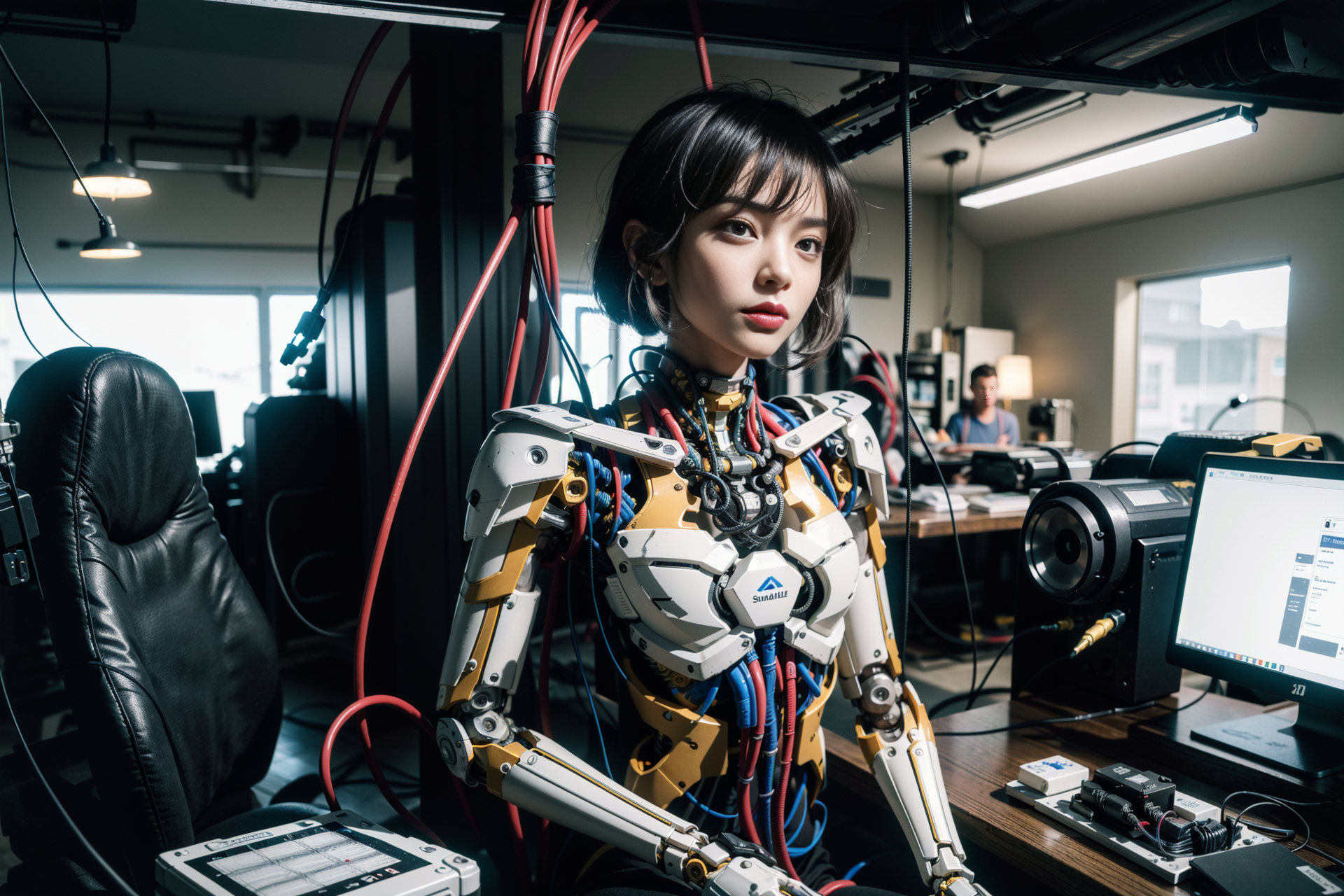 (((masterpiece))),(((best quality))),((ultra-detailed)),(highly detailed CG illustration),((an extremely delicate and beautiful)),(cute delicate face),cinematic light,((1mechanical girl)),solo,full body,(machine made joints:1.4),((machanical limbs)),(explosed muscles),(blood vessels connected to tubes),(a brain in container:1.3),((mechanical vertebra attaching to back)),((mechanical cervial attaching to neck)),machanical limbs,blood vessels connected to tubes,mechanical vertebra attaching to back,mechanical cervial attaching to neck,sitting,wires and cables connecting to head,((sitting)),expressionless,(wires and cables attaching to head and body:1.5),small breasts,short hair,(character focus),science fiction,(masterpiece, best quality, ultra-detailed, best shadow),<lora:A-Mecha_SuperMecha>,