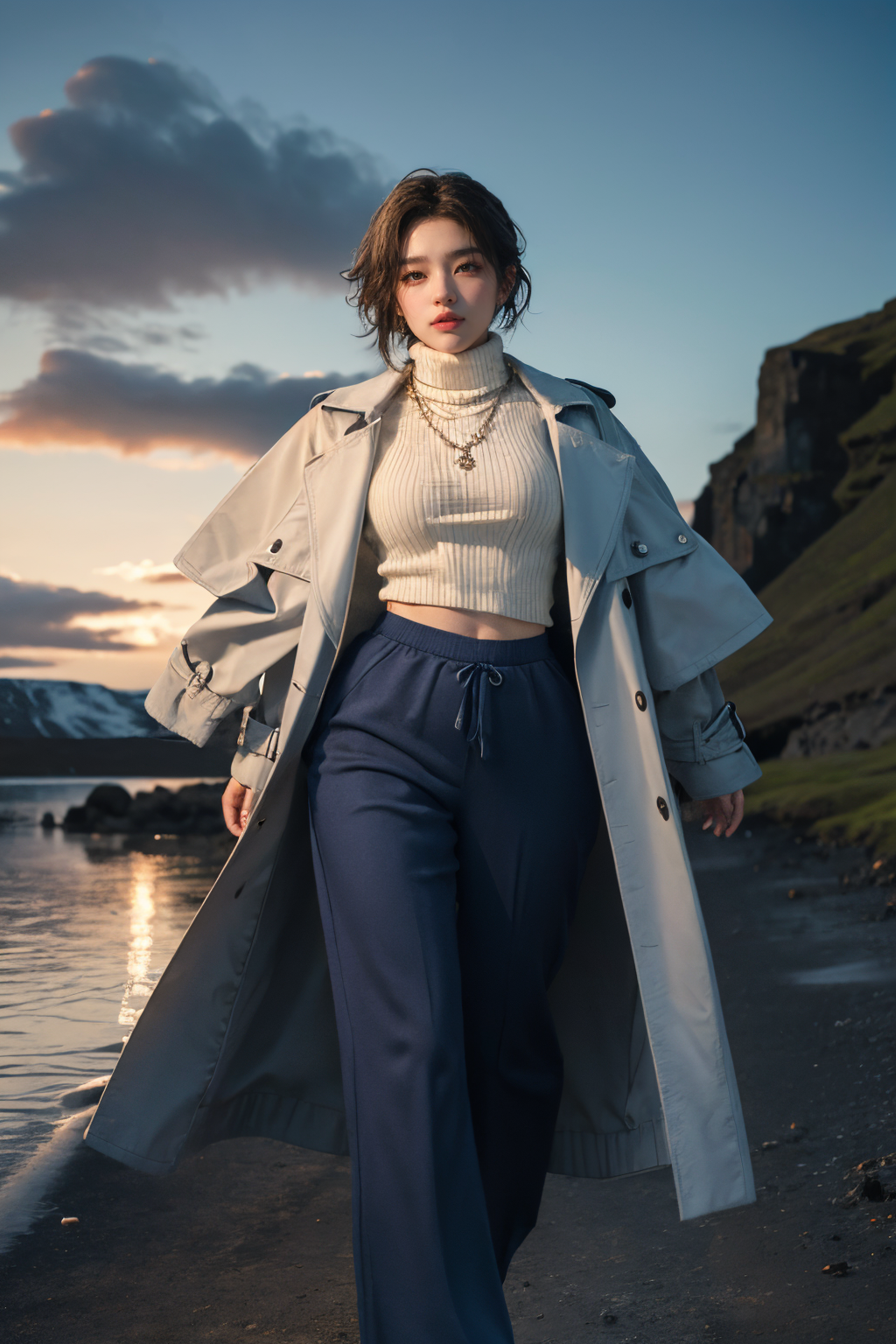 masterpiece,ultra realistic,32k,extremely detailed CG unity 8k wallpaper, best quality,(winter day ),lady ,necklace ,eardrop, The Blue Lagoon, Iceland, ( dark blue Layer a trench coat over a turtleneck sweater with wide-leg pants ) , multicolored hair hair short hair ,