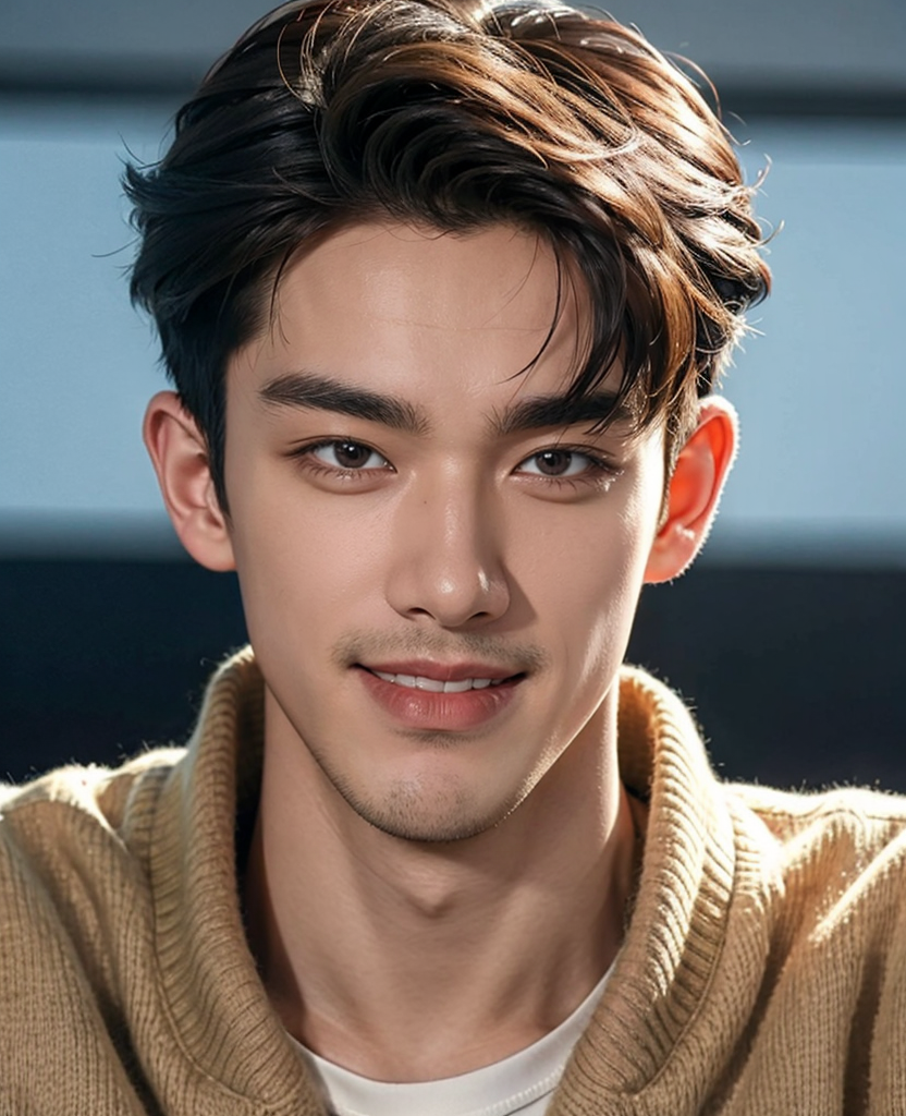 handsome male,25yo,sweater, extreme_close_up, smile, <lora:Kpop Boy:0.3>, <lora:add_detail:1>,