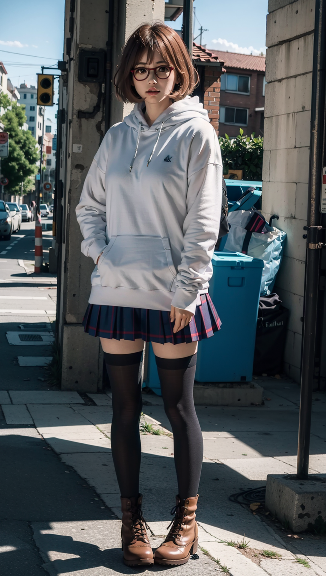 (8k, RAW photo, best quality, masterpiece:1.2), (realistic, photo-realistic:1.37), ultra highres, depth of field, chromatic aberration, caustics, Broad lighting, natural shading,Fujifilm XT3,masterpiece,ultra detailed,Kuriyama Mirai,1girl, solo,full body,hoodie,pleated skirt,zettai ryouiki,boots, shy,city, street,building, <lora:Kuriyama Mirai harem outfit Winter clothes scarf track suit:0.8>