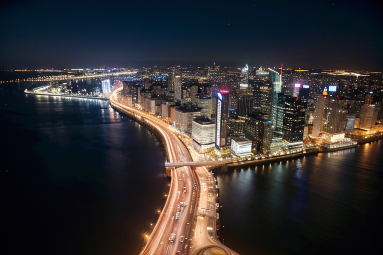 masterpiece,hyper realistic,lifelike texture,dramatic lighting,Nikon RAW photo,8k,Fujifilm XT3,best quality,realistic,(photorealistic:1.4),ultra detailed,extremely detailed,, ,highres,, ((See the city night view from a high altitude perspective)),(brightly lit:1.2), (beautiful starry sky:0.7), (There is the sea on the left:1.1), ((the city near the seaside)), There are many high-rise buildings,A building with a special shape,, ulzzang-6500-v1.1,