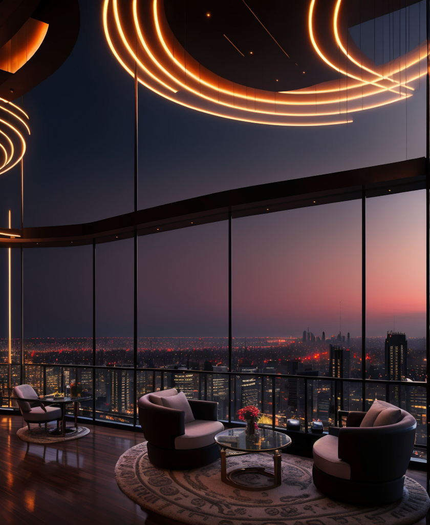 interior, luxurious hotel, luxurious decoration design, evening scenery, outside scenery of the bustling city, bright lights, charming scenery, excellent image quality, high definition 8 k, beautiful light, excellent photography master