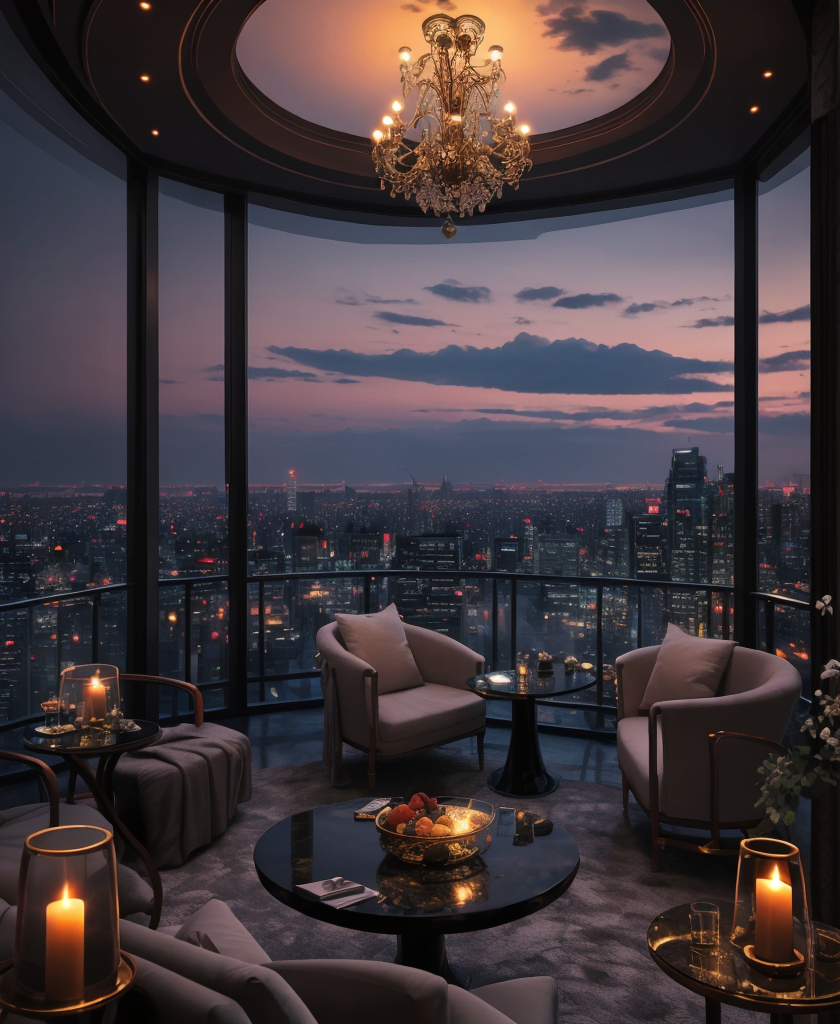 interior, luxurious hotel, luxurious decoration design, evening scenery, outside scenery of the bustling city, bright lights, charming scenery, excellent image quality, high definition 8 k, beautiful light, excellent photography master