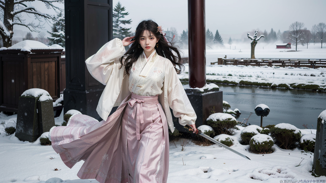 dark sky,feature article,ancient background,Ancient, Warring States,Dispute,ancient china style,A girl stands in front of the main hall gate in the snow with melancholy eyes,(1girl),dress,skirt, long skirt,((holding a long sword)),(solo:1.4),(long floating hair), jewelry in hair, extremely detailed, streamer, dancing, (floating ribbon:1.2), wind,china landscape, fantastic, spectacular, (fog:1.4),(snowing:1.4),sorrow,snow,martial arts, swordsman,heavy snow,look into the distance, photorealistic,realistic,photograph,8k raw photo,ebst quality,ultra high res,masterpiece,official art,ultra detailed, beautiful and aesthetic, masterpiece, best quality,