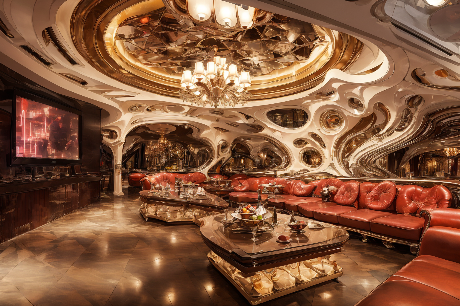 Ktv,scenery,Indoor,karaoke,<lora:20240122-1705863851919-0002:0.7>,couch,table,television,champagne,high end clubhouse,best qualtiy,masterpiece,movie-level quality,<lora:UIAQX1.0:0.7>,UIAQX,Futuristic architectural panorama,HD lens,bold elegance,Zaha Hadid,extremely wide angle lens,cold and warm contrast,private room,fireplace,