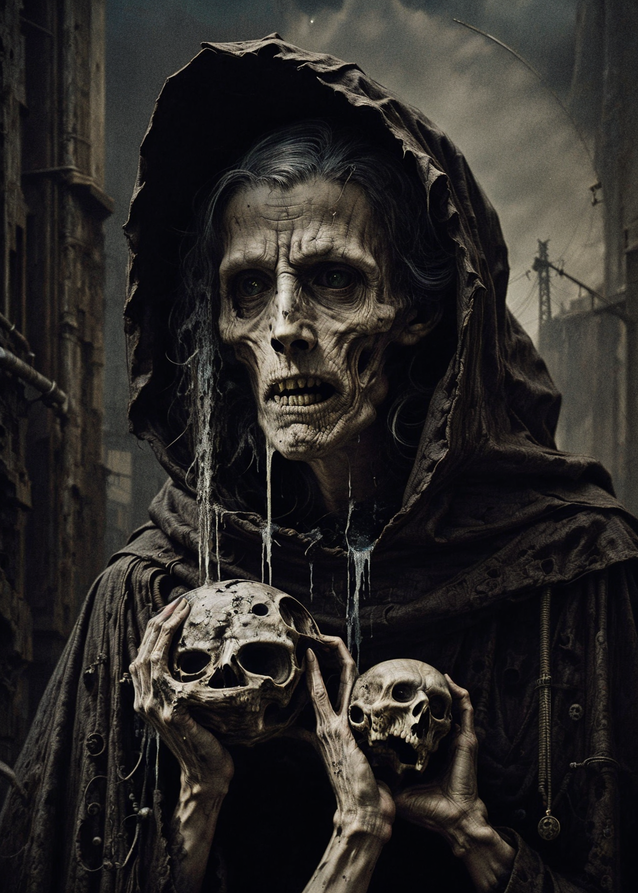 (masterpiece, best quality), darkened, solo, gloves, 1boy, holding skull, upper body, male focus, teeth, hood, portrait, hood up,skull,horror \(theme\) <lora:darkened:0.8> <lora:add_detail:0.7> <lora:epi_noiseoffset2:0.8> BREAK <lora:vergvoktre_finetuned:0.666> by vergvoktre, dramatic, gritty, nightmare, intricate details, hyperdetailed, cinematic, dark shot, film grainy, soothing tones, muted colors, technicolor