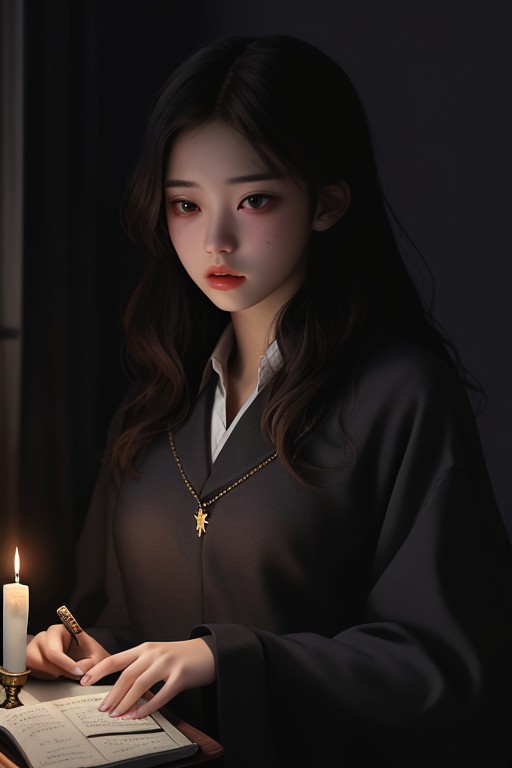 Realistic sexy college girl reading a spell book in a dark room by candlelight