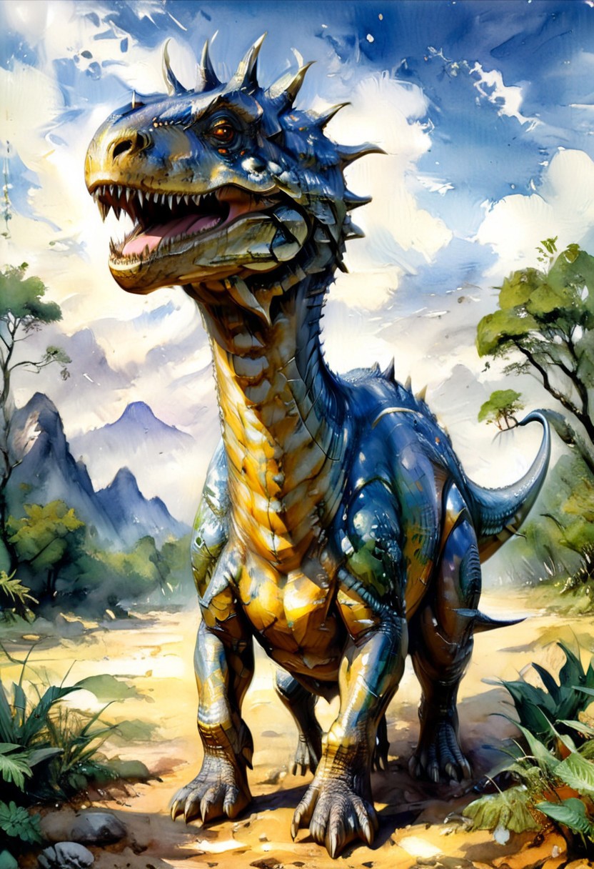 Masterpiece Ultra-detailed illustration of a Dinosaur, bottom view,Outdoors, ral-swarcrystl,16k,F2.8,RAW Photo,ultra detailed,soft lighting,real life,ultra detailed, by hajime sorayama, ink, watercolor