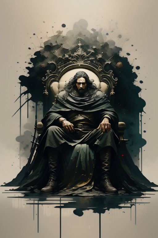 Masterpiece Illustration, high quality, high resolution 16k, a painting of a man sitting on top of a throne holding a sword, discord profile picture, post appocalyptic, stark, phone wallpaper, scariest looking man alive, characters merged, rennaissance masters portrait, gondor, unmasked, to be, prisoner, photoshoped, king, jeff, oil painting, ink