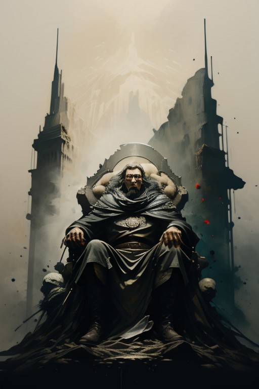 Masterpiece Illustration, high quality, high resolution 16k, a painting of a man sitting on top of a throne holding a sword, discord profile picture, post appocalyptic, stark, phone wallpaper, scariest looking man alive, characters merged, rennaissance masters portrait, gondor, unmasked, to be, prisoner, photoshoped, king, jeff, oil painting, ink