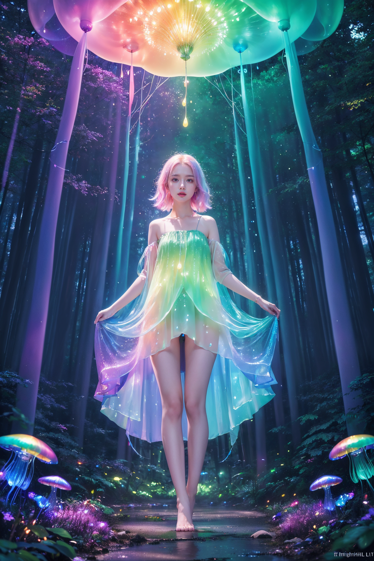 (masterpiece:1.1),in a fantasy world full of imagination,a girl with pale skin,in the wonderful rainbow forest at night,shiny skin reflecting the rainbow jellyfish,Surrounded by glowing rainbow jellyfish and colourful forest scenery,captured in highly detailed,(bokeh:1.3),cinematic lighting,dramatic scene highlighting rainbow jellyfish reflections on the girl,(colorful mist:1.3),((best quality)),((highres)),