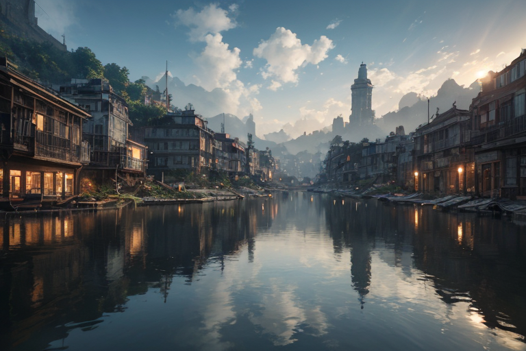(8k, RAW photo, best quality, masterpiece:1.2),(realistic, photo-realistic:1.37),octane render,ultra high res,ultra-detailed,professional lighting,photon mapping,radiosity,physically-based rendering,ue5,((island sanctuary)),((ancient fallen kingdom)),((reflections in water)),((raytracing)),((drowned city)),(depth of field),