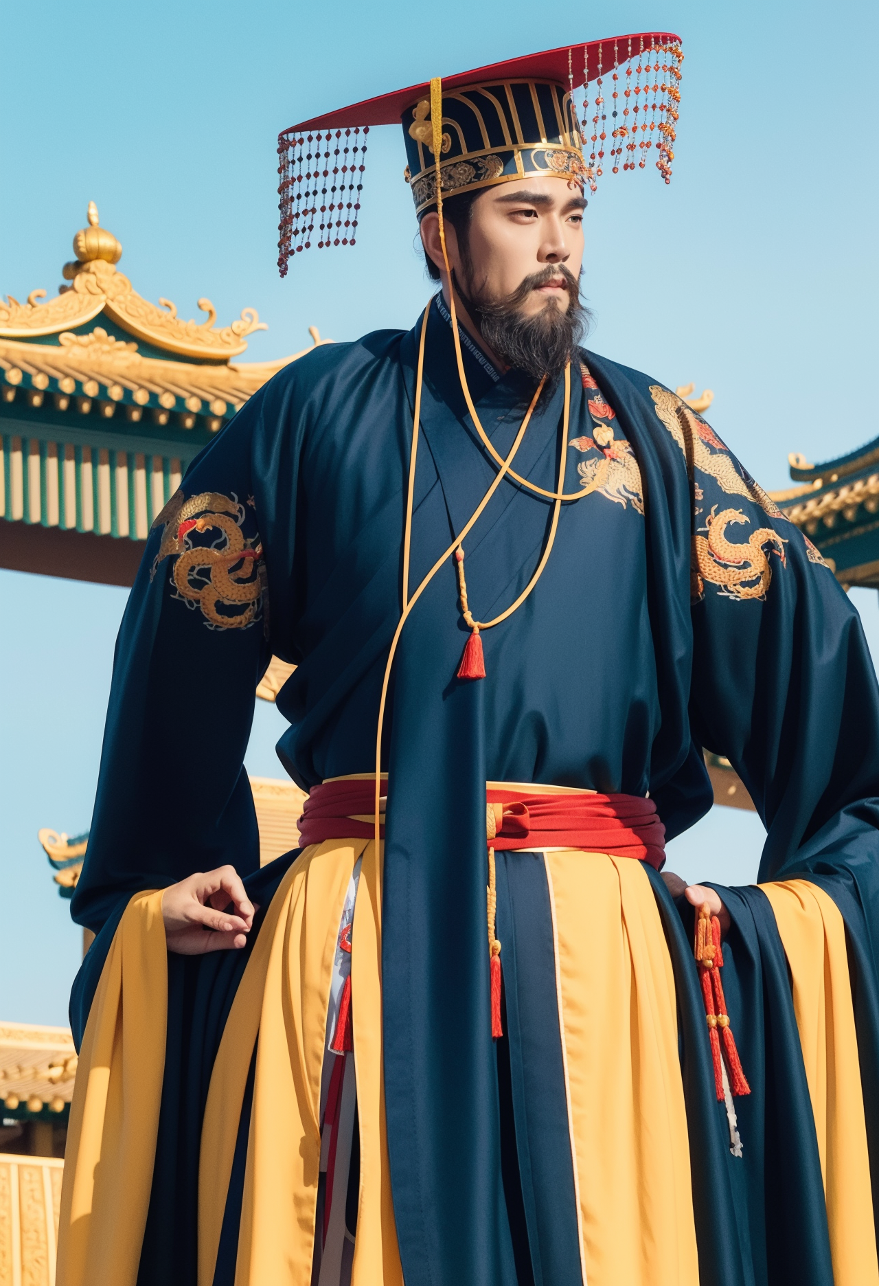 ((masterpiece)),(((best quality))),((ultra-detailed)),((illustration)),dynamic angle,1boy,handsome,bust,Photography,hanfu,manguan,mianfu,beard,chinese clothes,black clothes,<lora:mianfu:0.8>,emperor,outdoors,edgQuality,blue sky,