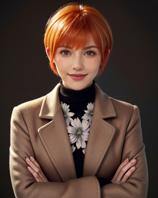 solo, 1girl, crossed arms, smile, blush, medium breasts, orange hair, pixie cut, silver eyes, beautiful detailed face, ultra detailed eyes, dark brown overcoat, glttering light, Zantedeschia \(flower\), floral background